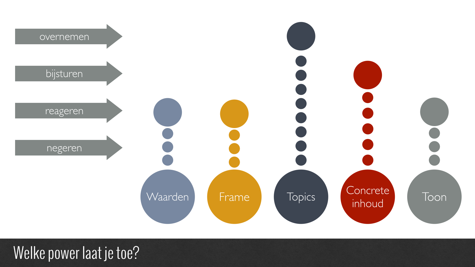 In elke uiting van een Power Shouter kon ik op zijn minst vijf inhoudsvelden isoleren. Ze hadden het over waarden, thema’s, concrete acties, tonaliteit en frames. Op elk van die velden kon ik bepalen of ik me er sowieso al kon bij aansluiten of ze zou overnemen, mezelf volgens hun input zou bijsturen, erop zou reageren vanuit mijn houding, of het zou negeren.