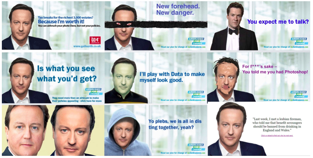 Toen Cameron tijdens een vorige verkiezingscampagne wel heel doorzichtig probeerde om zijn imago bij te kleuren, werd hij op social media resoluut teruggefloten. Zijn gephotoshopte poster was het mikpunt van spot, er werd zelfs een website opgestart waar je je eigen parodie kon samenstellen. En ook zijn gewoonte om in toespraken te verwijzen naar sociale deelgroepen werd ontmaskerd als onoprecht en een flauwe beïnvloedingspoging. Zijn geloofwaardigheid werd al na enkele weken ondderuit gehaald, waardoor hij wel verplicht werd om eerlijker en authentieker te gaan communiceren. De megafoons hadden duidelijk te kennen gegeven dat ze het ongeloofwaardig oppoetsen van blazoenen niet op prijs stelden.