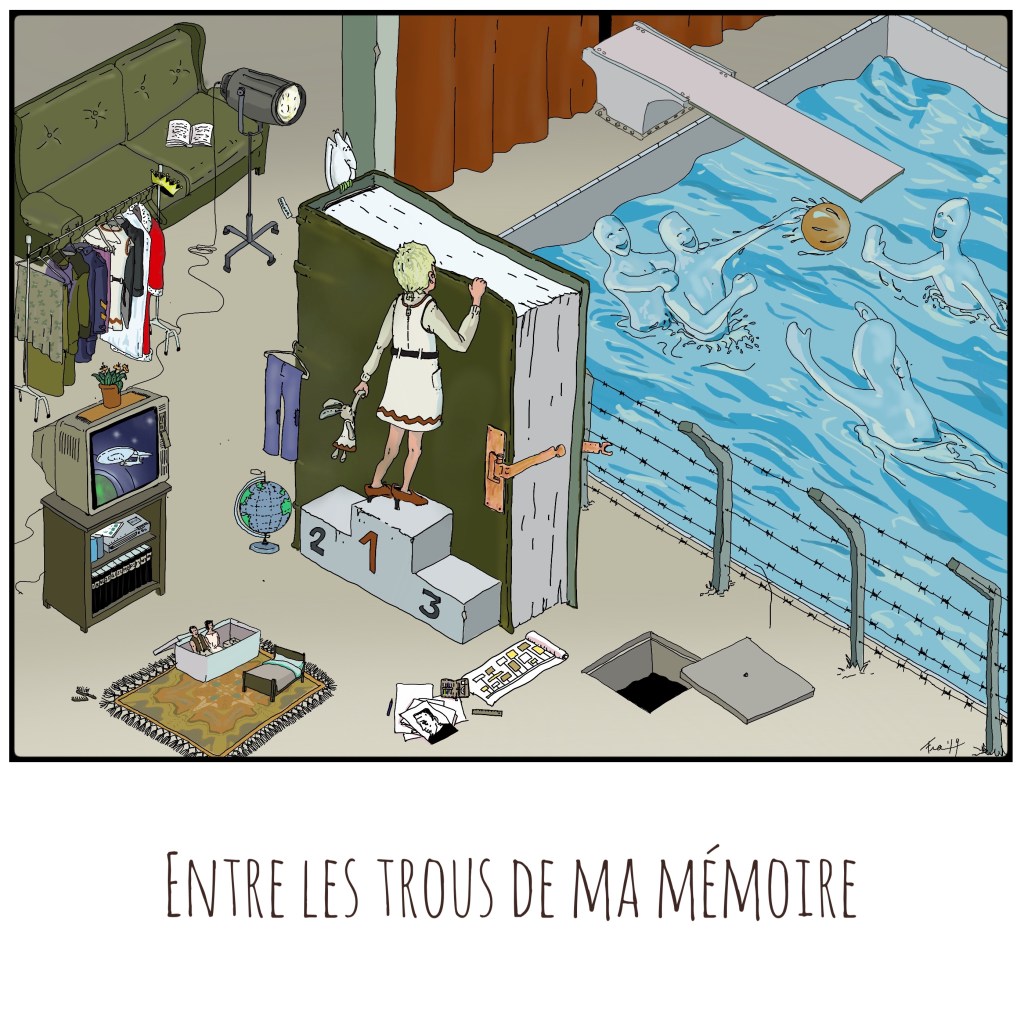 Begrijp me niet verkeerd, ik weet ook wel dat een madeleine een verloren tijd weer kan laten opduiken. Een melodie kan een hele sfeer oproepen en een oude foto trekt een blik aan herinneringen open, ja, een geheugenpaleis kan boeken vol informatie bevatten… Maar narratieven maken het toch hanteerbaarder. Een goed geheugenpaleisbouwer zal overigens niet die ene telefoon met dat kleur en die stekker op dat kastje zetten om een bepaalde associatie op te roepen. Een algemeen idee van telefoon kan vaak volstaan. In de tekening hieronder tekende ik niet per se de televisie, of de bank, of het tapijtje waarmee ik ben opgegroeid. Ze volstaan om de associatie op te roepen via enkele in mijn hoofd verwoorde en zo verankerde elementen. Zelfs het wit-met-rode jurkje dat meermaals op de prent terug komt, klopt niet. Ik vermoed niet dat ik dat ooit heb aangetrokken. Wiske had dat jurkje en Wiske was ook prominent aanwezig in mijn jeugd, maar dat was niet het jurkje dat ik zo vaak bij mijn nicht ging lenen. Als ik mij niet vergis, was dat monochroom rood of roze. Maar wellicht vergis ik me.